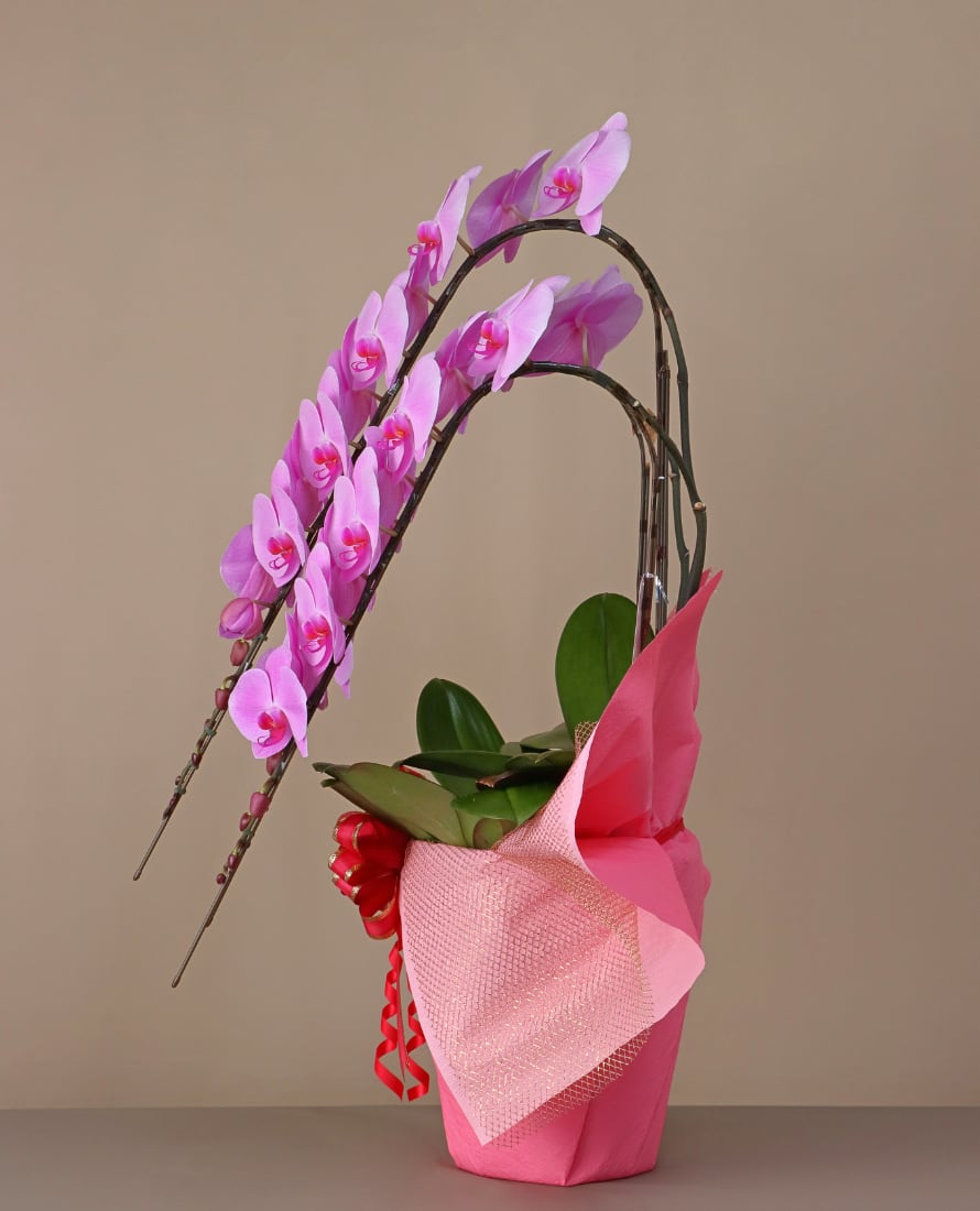 3本立 ロング(42輪~45輪程度) ピンク 【華やかさと優しさを纏う特別な一鉢】柔らかなピンクの花が空間を明るく彩る一鉢に仕上げました。女性へのお祝いギフトや、特別な記念日の贈り物に人気です。