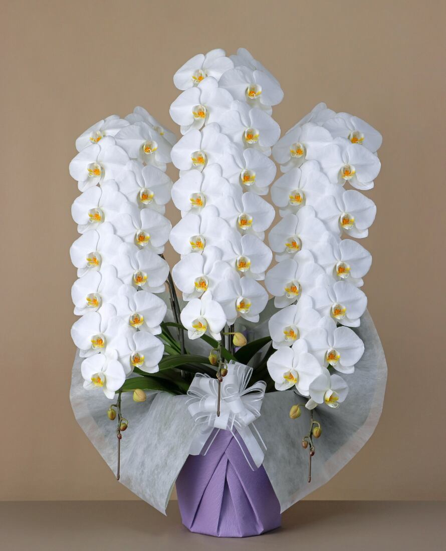 【法事・法要】3本立 ロングPlus(48輪~51輪程度) 【故人を偲ぶ特別な清らかさ】圧倒的なボリュームと品格を兼ね備えた一鉢に仕上げました。法要や仏壇への、特別な供花に最適です。